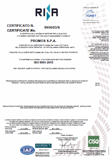 La nostra azienda, attraverso la sua continua ricerca di migliorare sotto ogni aspetto la propria attività di progettazione, produzione e commercializzazione di dispositivi ospedalieri monouso per la raccolta di rifiuti organici, oltre che di commercializzazione, installazione ed assistenza delle macchine maceratrici dei suddetti rifiuti, vanta requisiti tali che le hanno permesso di ottenere significative certificazioni: