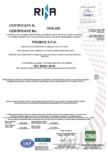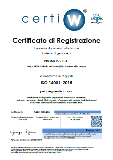 Our company, through its continuing quest to improve its design, production, and marketing of disposable single-use hospital devices for the collection of organic wastes, as well as the marketing, installation, and assistance for the shredding machines for such wastes, boasts qualities and meets requirements that have enabled it to obtain significant certifications:
